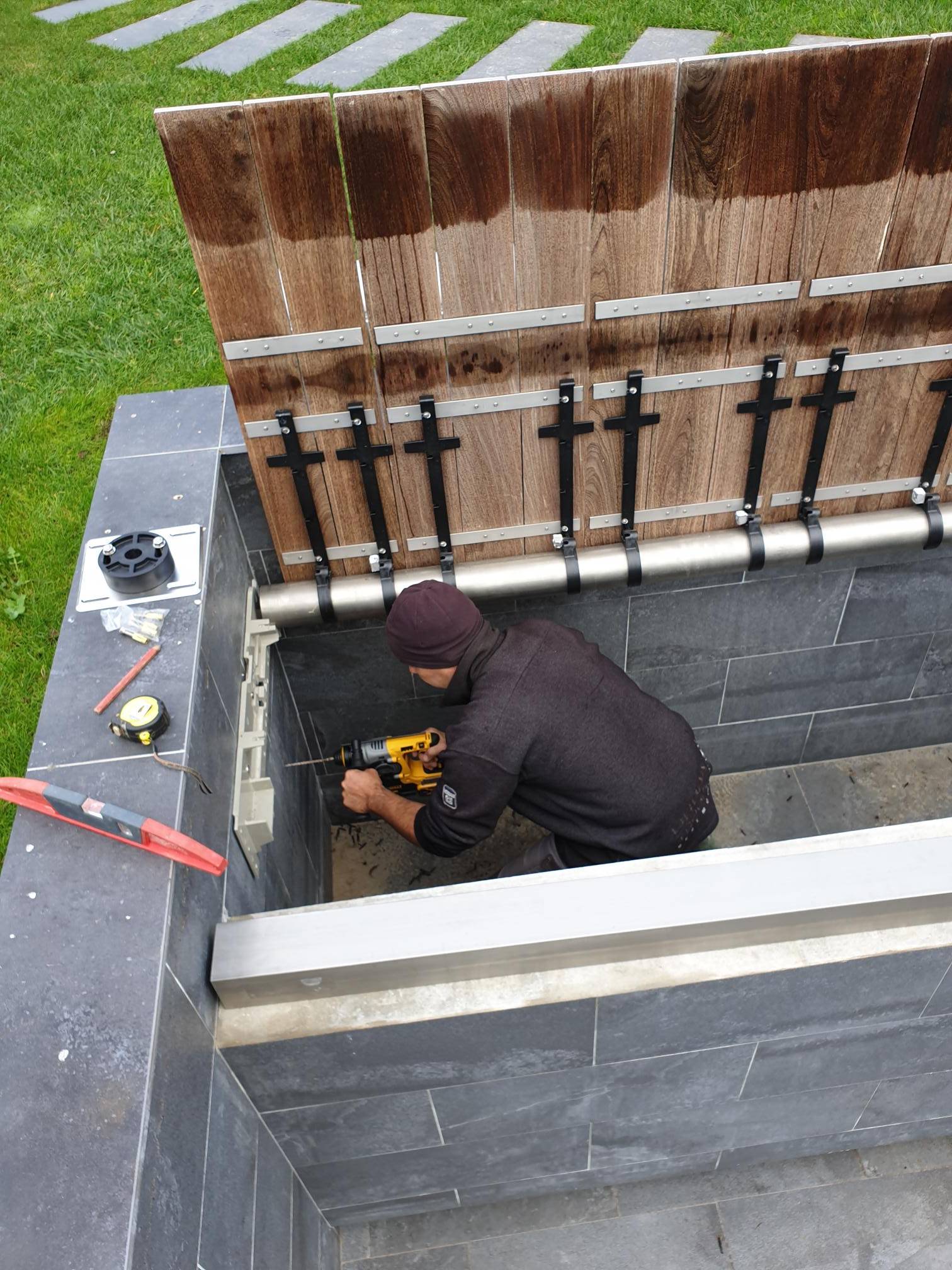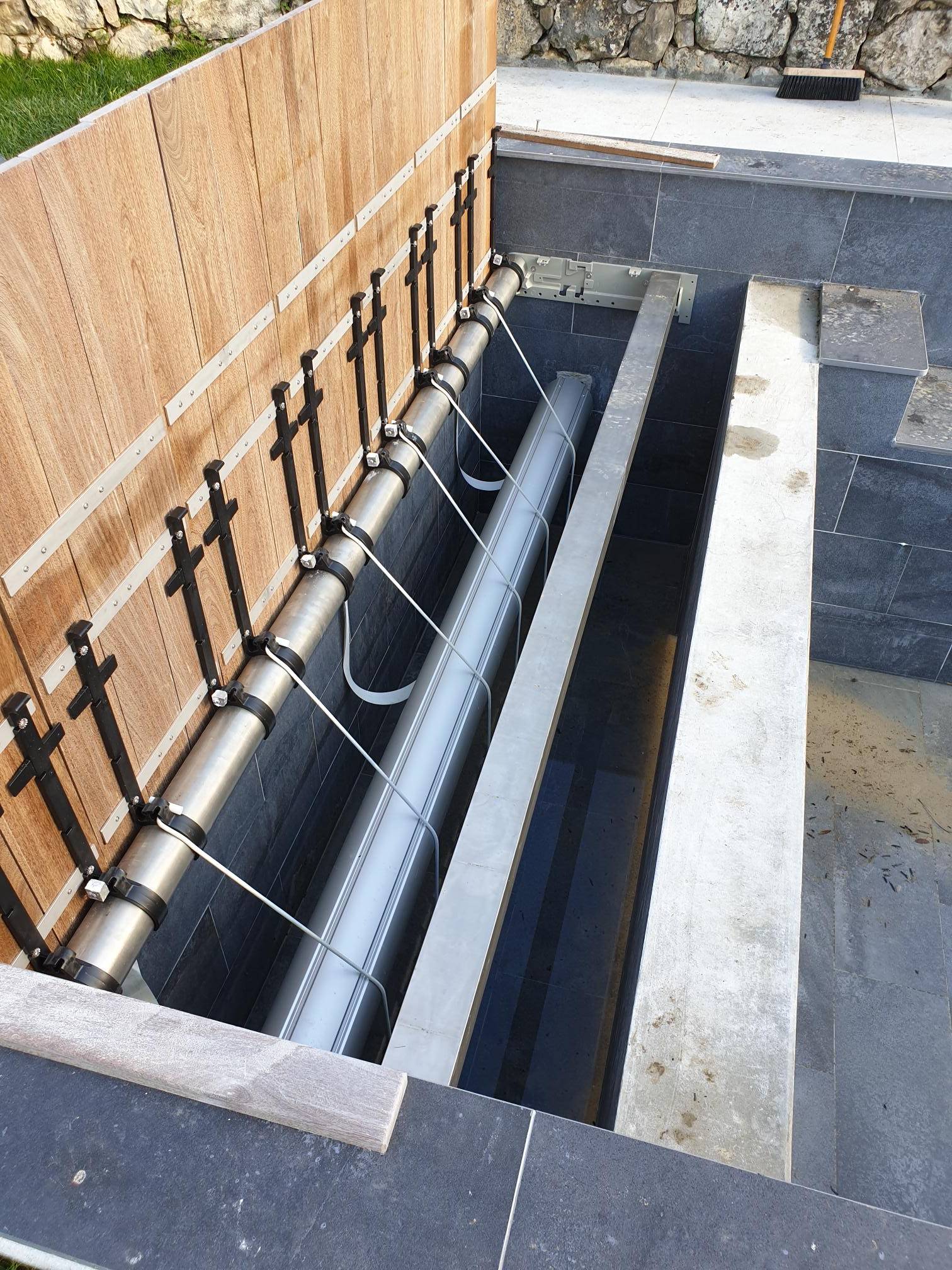 – Volet immergé à différentes hauteurs, moteur dans l’axe ou déporté, caillebotis bois IPE ou plaques à rhabiller ou plaque à carreler, caillebotis accoté ou couvrant.